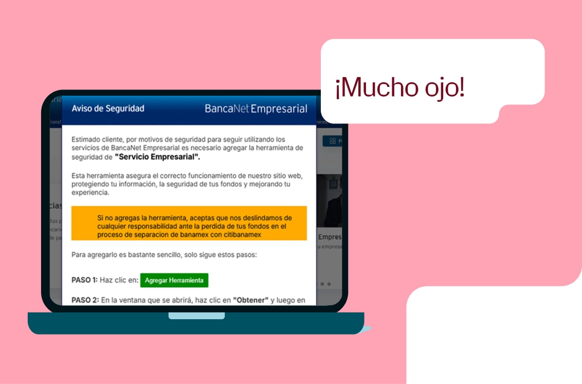 Si ves esta pantalla en BancaNet tu equipo podría tener malware. Evita usar la banca electrónica y consulta a un especialista en seguridad.