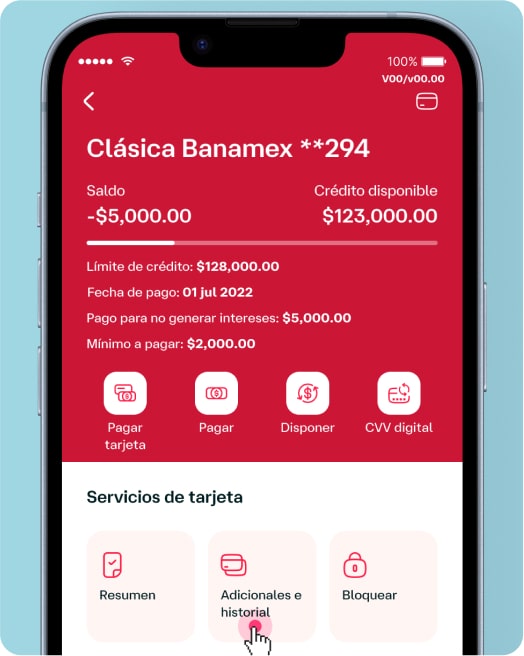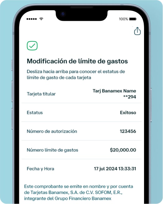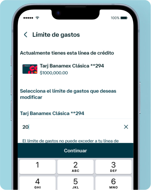 Una vez que recibas la tarjeta adicional, puedes fijar un límite de gastos para tus tarjetas adicionales desde nuestra aplicación App Banamex o en BancaNet. También puedes llamar al teléfono que se encuentra al reverso y asignar el límite de crédito que quieres para esa tarjeta en particular.